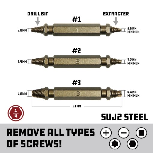 Removes many types of screws and bolts (Including Phillips, Slotted, Robertson, Hex, Torx)
